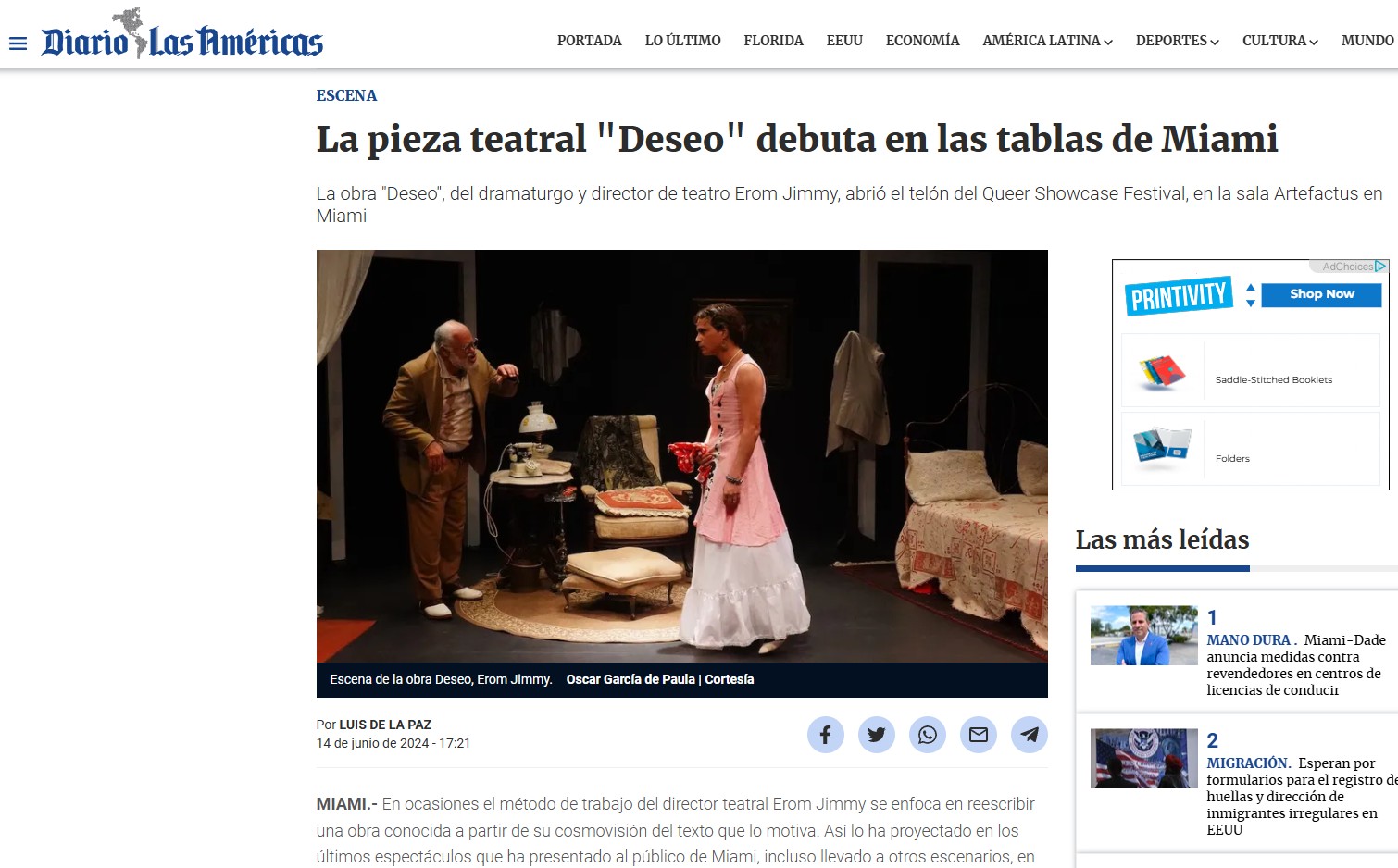 Miami Factory Theater presenta la obra “Deseo”, una versión de Erom Jimmy de “Deseo bajo los olmos” del dramaturgo norteamericano Eugene O’Neill. Factory Theater, en su búsqueda de nuevas formas de la narrativa escénica, rehace un texto sólido y universal e introduce, por primera vez en la escena de Miami, la participación de las actrices transgénero Lola Alejandra Bosch y Ava, junto a los actores Christian Ocón y Raydel Casas. Este elenco diverso aporta una nueva dimensión a una obra clásica, ofreciendo una experiencia teatral contemporánea.